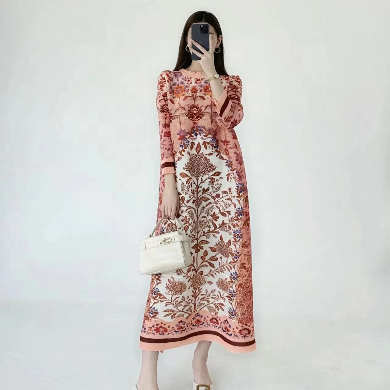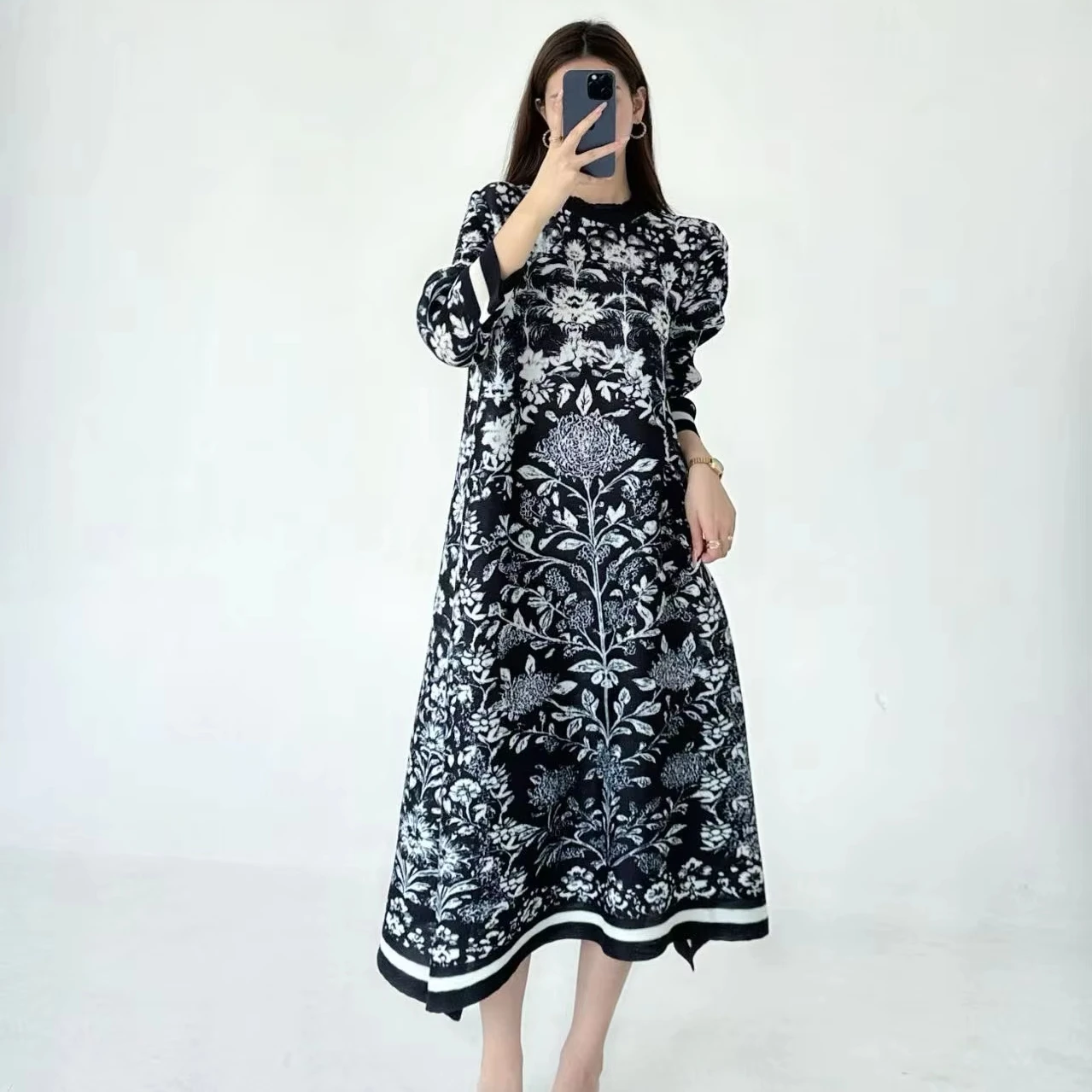 2025 Autumn New Women's Retro Printed Round Neck Long Sleeve Midi Dress Casual Loose Comfortable Leisure Eco-Friendly